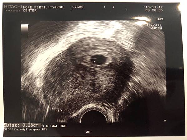禮拜一的早上總是特別多人,等待的時間比較長,好不容易聽到我的名字,進入診間看著螢幕,小到不行的胚囊,看到0.41cm的數字,這數字也跟我太有緣了吧,第一次植入時,5週1天回診時也是0.41;原本以為太小,但諮詢師說0.3~0.5cm都是正常的尺寸喔。會開始減少用藥,等待下禮拜的回診。