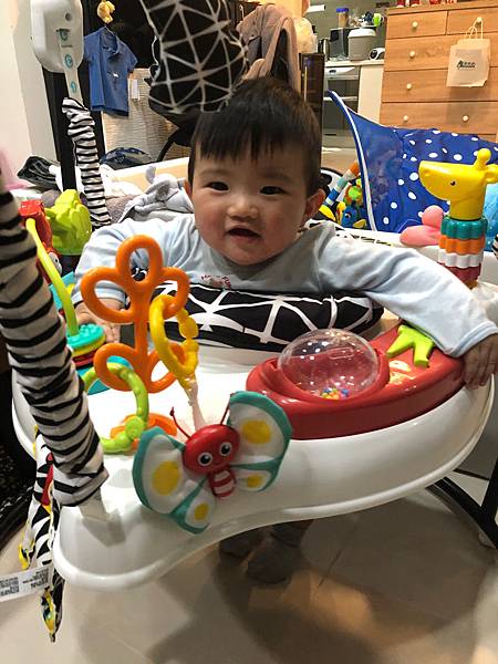 凱開開始會坐後,他就很討厭趴,但坐也好,他可以自己在遊戲墊前玩一段時間,保母和我有事要忙的時候,把他放地上一下還滿方便的。在美國的時候,堂哥借了我們一個跳跳椅”jumperoo”,從此開啟了凱開愛跳的不歸路;回台灣後一直找不到哪裡有賣跳跳椅,不知道為什麼好像整個台灣禁止進口一樣,完全找不到(除非租借玩具的買家,但開把非常反對用二手玩具,因為擔心清潔不夠有細菌),最後我們只好請由美國飛回台灣的朋友幫我們帶回來,之前回來行李已經7件無法自己帶了。還好~有這個跳跳椅,因為他真的太~愛了,愛到沒有在上面的時候,會有隱形的跳跳椅,會無止境的站著跳動,但我看有些研究是反對跳跳椅的,因為對寶寶的腦還什麼的會有影響,所以我們盡量不讓他跳太久,不超過十分鐘為限。
